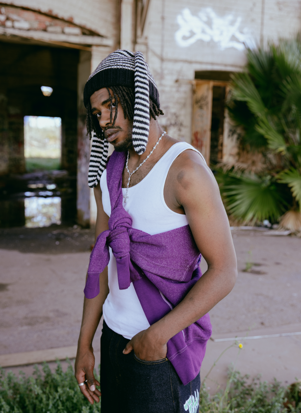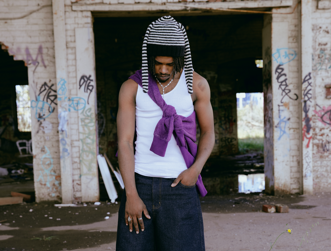 Long bunny-ear silhouette. Street-stripe knit. 90s grunge attitude.